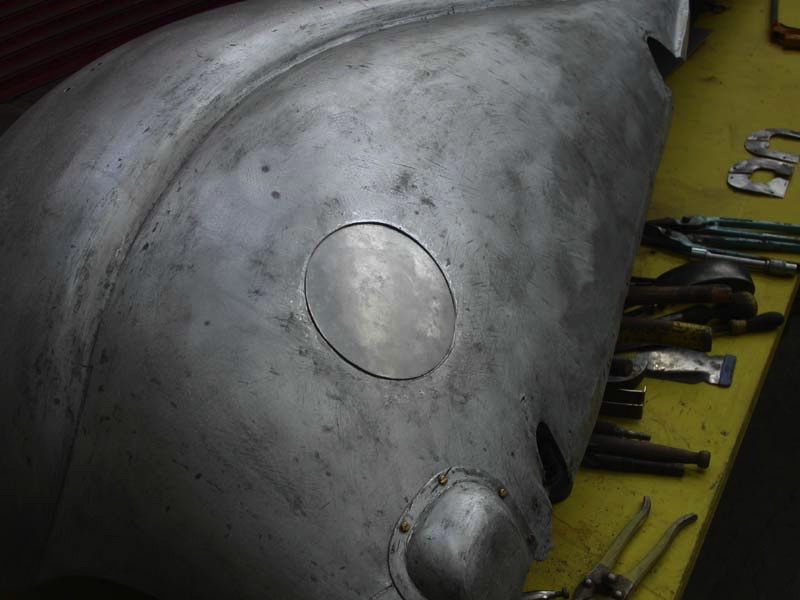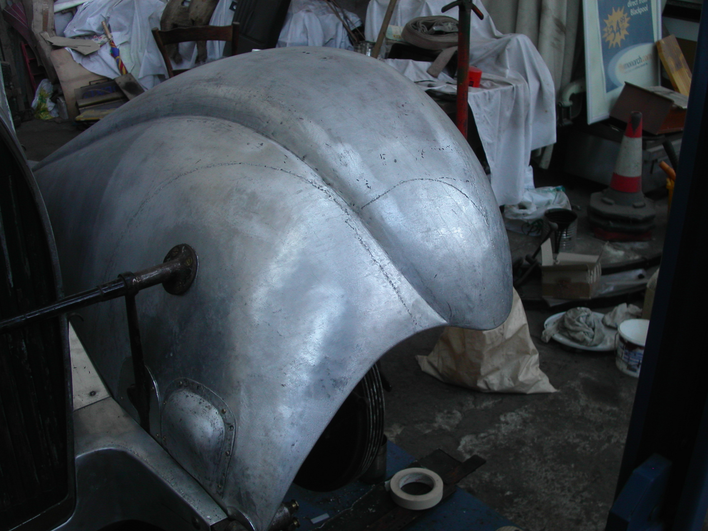 A James Young bodied Type 57 Bugatti in surprisingly good condition apart from a few areas where the aluminium had become brittle at the stress points. Unfortunatley, I don't have many photographs of this car as I carried out this work long before phones had cameras but I wanted to add this page as it demonstrates the working of aluminium using the minimum of tools, just a hammer and a tree stump for shaping combined with welding using the oxygen-acetelyne process.